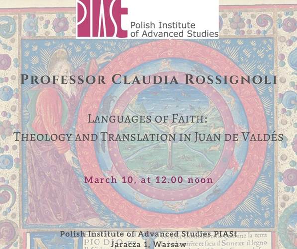 Zapraszamy na wykład stypendystki Polskiego Instytutu Studiów Zaawansowanych PIASt prof. Claudia Rossignoli Languages of Faith: Theology and Translation of Juan de Valdés 12 marca o godzinie 12.00 PIASt, ul. Jaracza 1, Warszawa