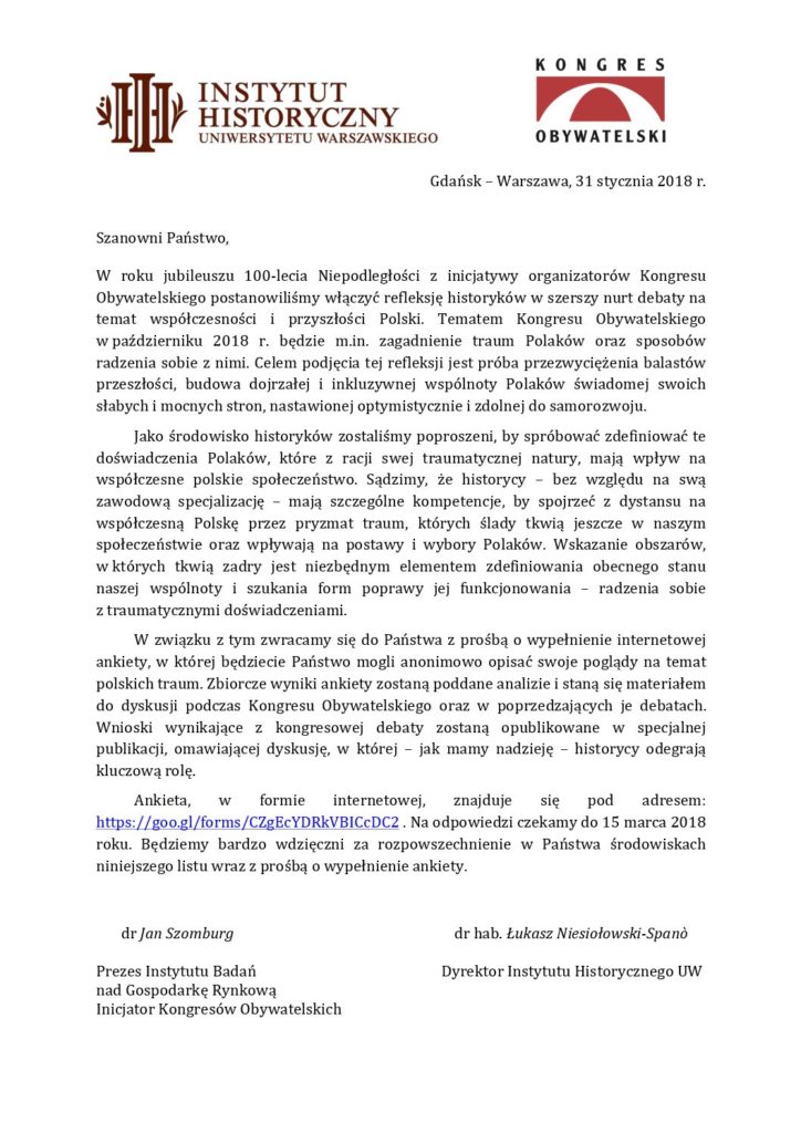 W roku jubileuszu 100-lecia Niepodległości z inicjatywy organizatorów Kongresu Obywatelskiego postanowiliśmy włączyć refleksję historyków w szerszy nurt debaty na temat współczesności i przyszłości Polski. Tematem Kongresu Obywatelskiego w październiku 2018 r. będzie m.in. zagadnienie traum Polaków oraz sposobów radzenia sobie z nimi. Celem podjęcia tej refleksji jest próba przezwyciężenia balastów przeszłości, budowa dojrzałej i inkluzywnej wspólnoty Polaków świadomej swoich słabych i mocnych stron, nastawionej optymistycznie i zdolnej do samorozwoju.