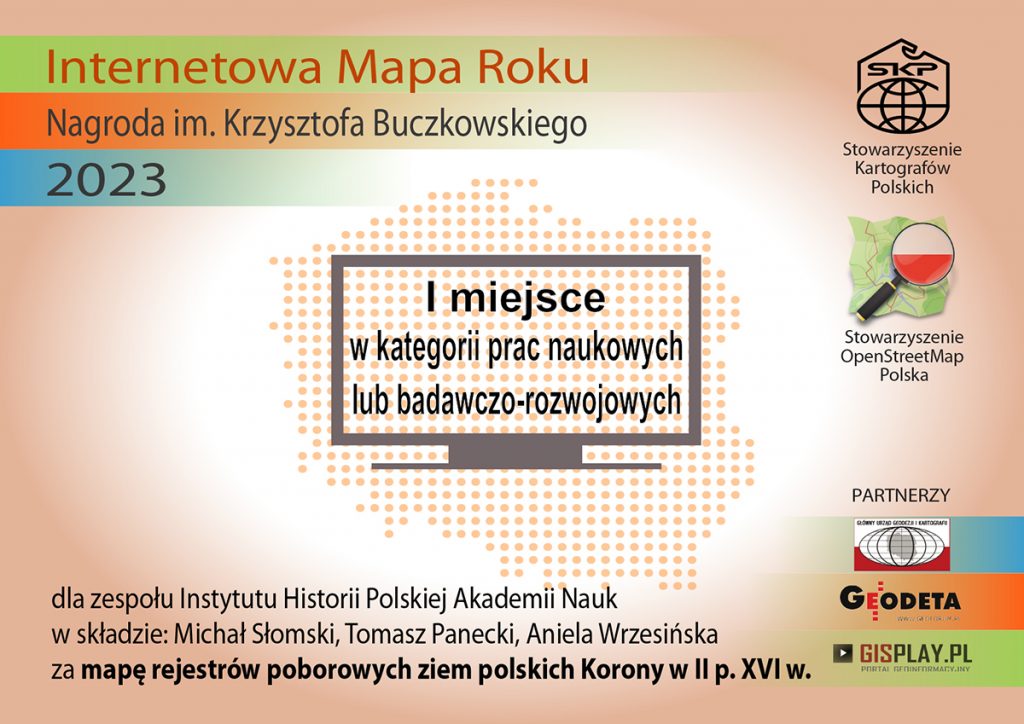 Cyfrowa mapa „Rejestry poborowe ziem polskich Korony w drugiej połowie XVI w.” zdobyła pierwsze miejsce w Konkursie Stowarzyszenia Kartografów Polskich w kategorii prac naukowych lub badawczo-rozwojowych.