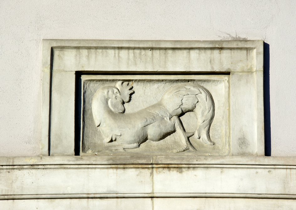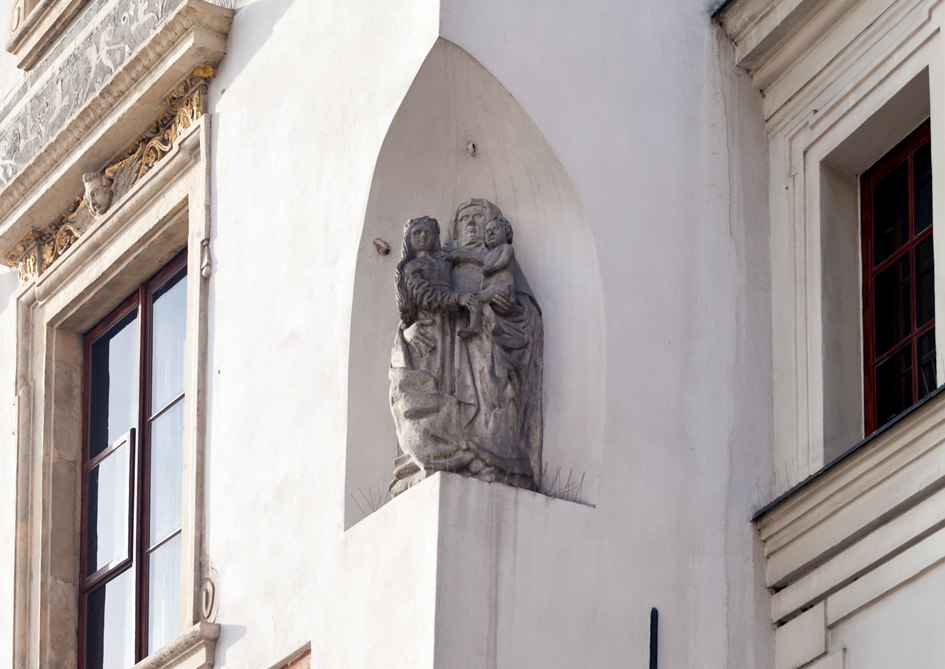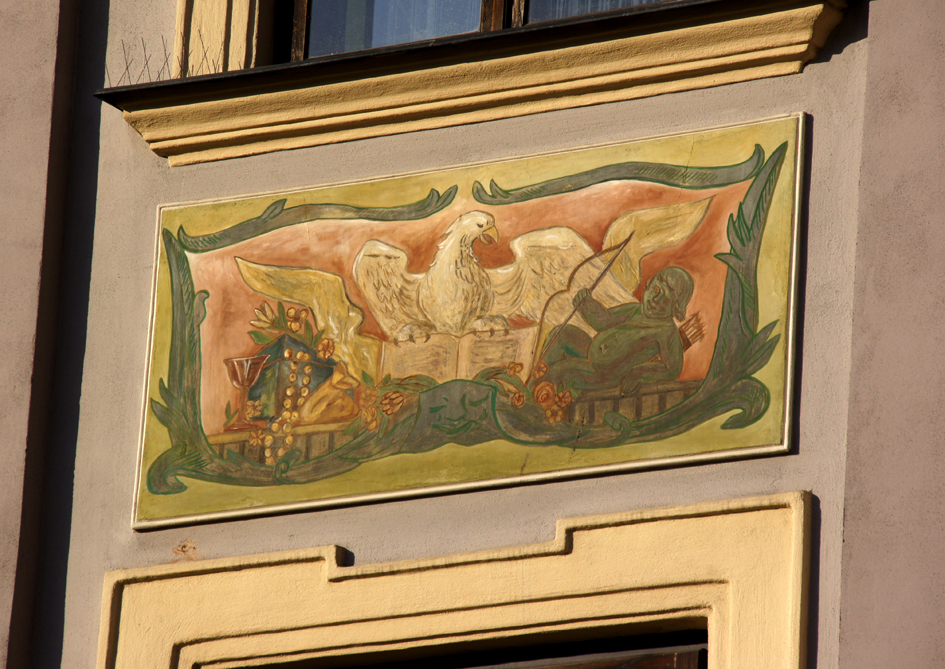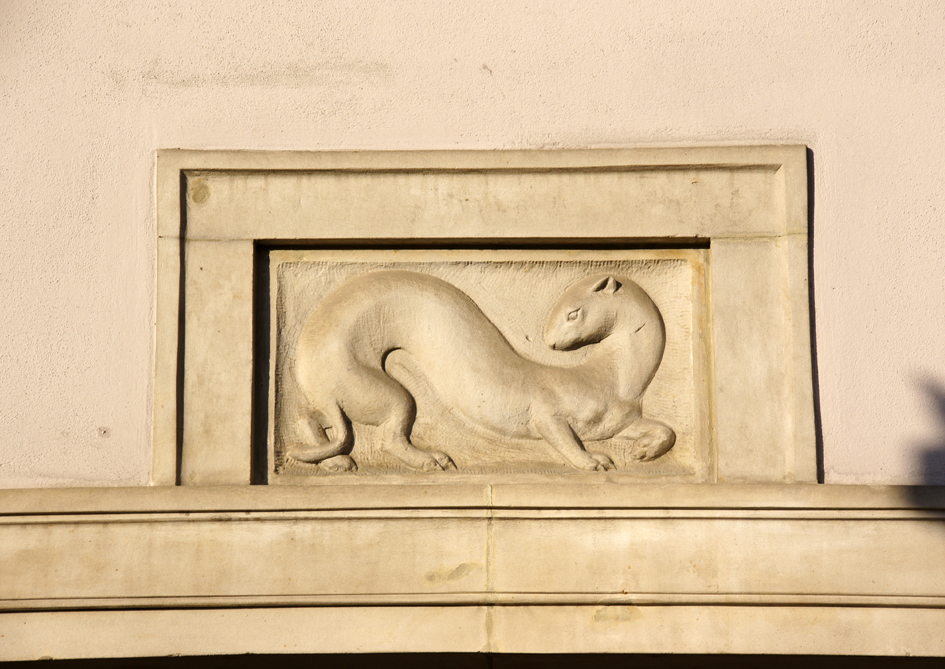 Na fasadzie kamienicy nr 29 płaskorzeźba łasicy